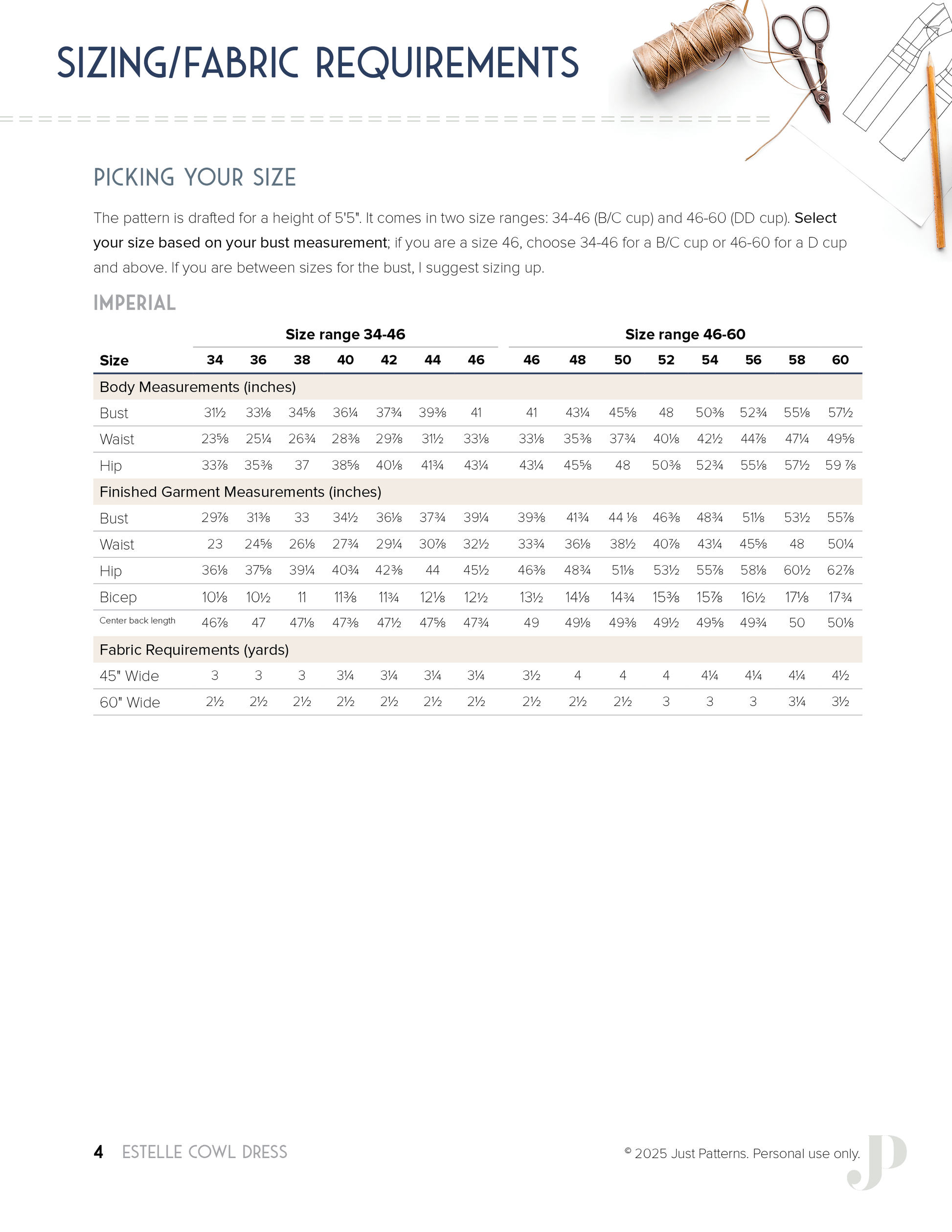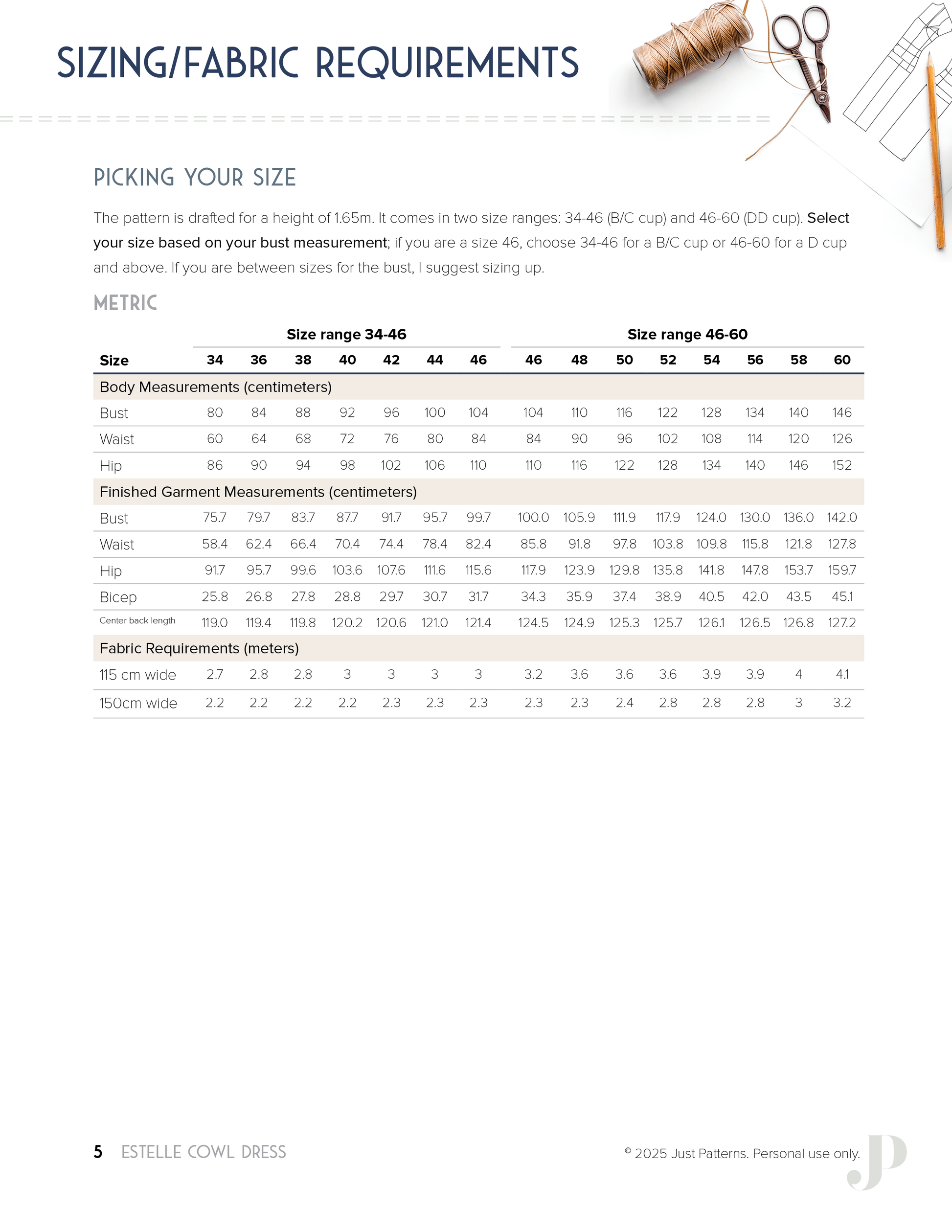 I draft and grade my sewing patterns for a height of 5’5” (1.65m) from size 34 to 60 (see below). When applicable, the size range is divided between 34-46, developed for B/C cup size, and 46-60, developed for a DD cup size.