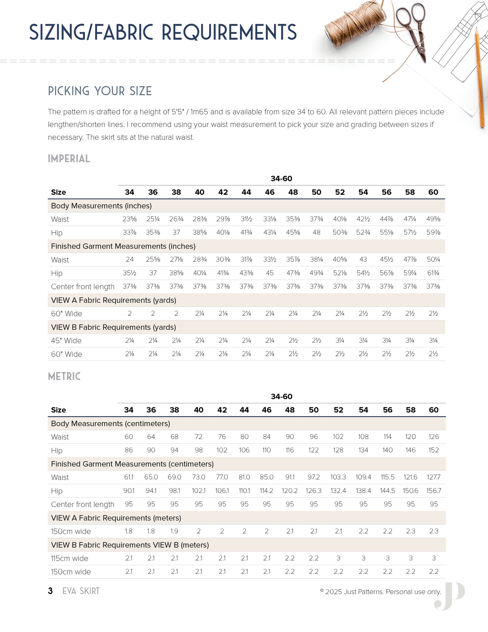 I draft and grade my sewing patterns for a height of 5’5” (1.65m) from size 34 to 60 (see below). When applicable, the size range is divided between 34-46, developed for B/C cup size, and 46-60, developed for a DD cup size.