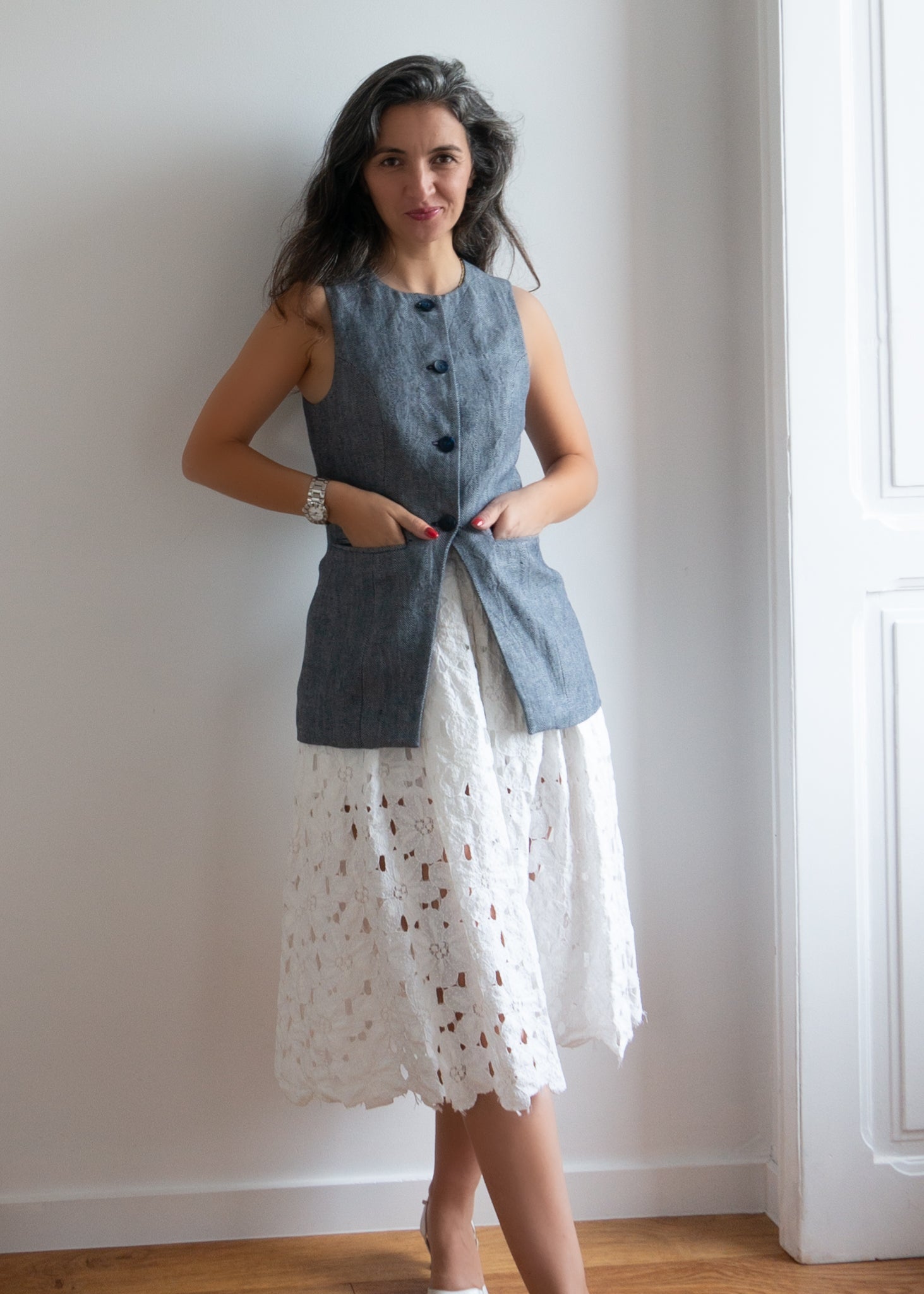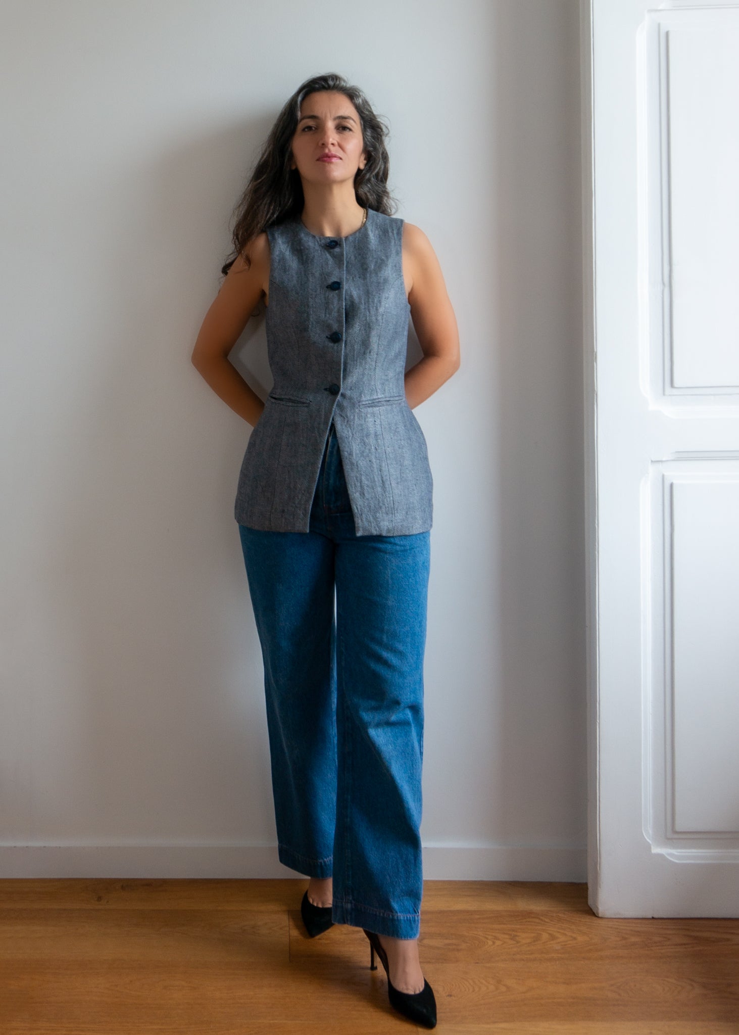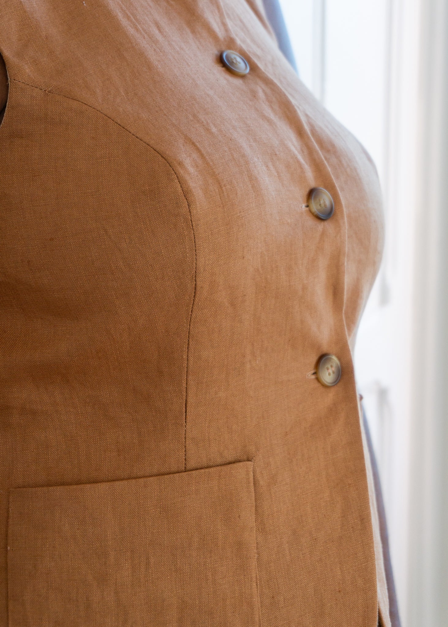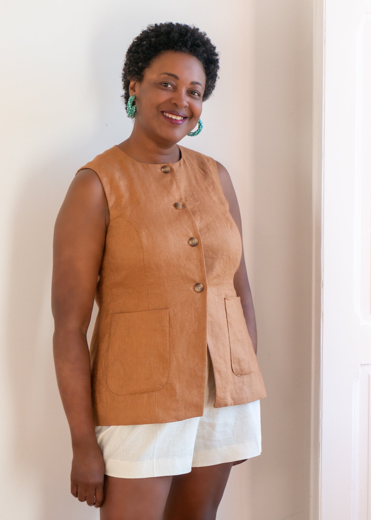 Love the tailored vest. I made it in a favorite long-stashed speckled cobalt Essex linen bland. I went with sz 44 and it fit perfectly without adjustments. I made a muslin in size 46 and found it was too big. I absolutely love the patch pocket instructions. But I had a hard time understanding how to sew the hem. I ended up with good results, but I will look for a video tutorial next time. I have more planned. I love the matching sets I've been seeing on Instagram.
