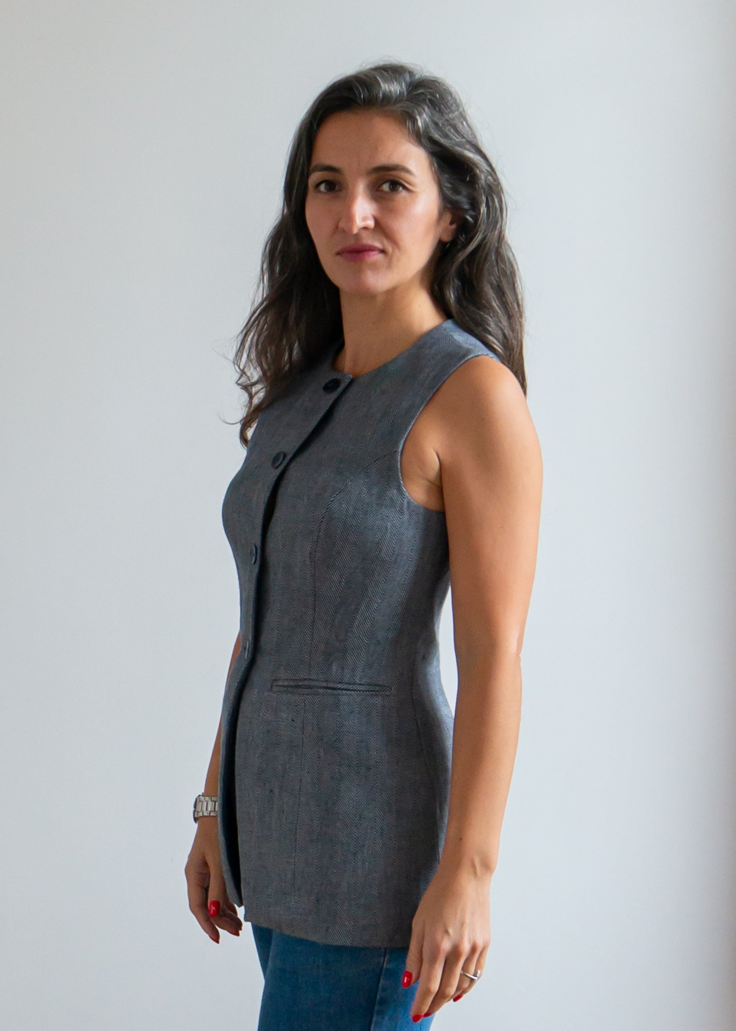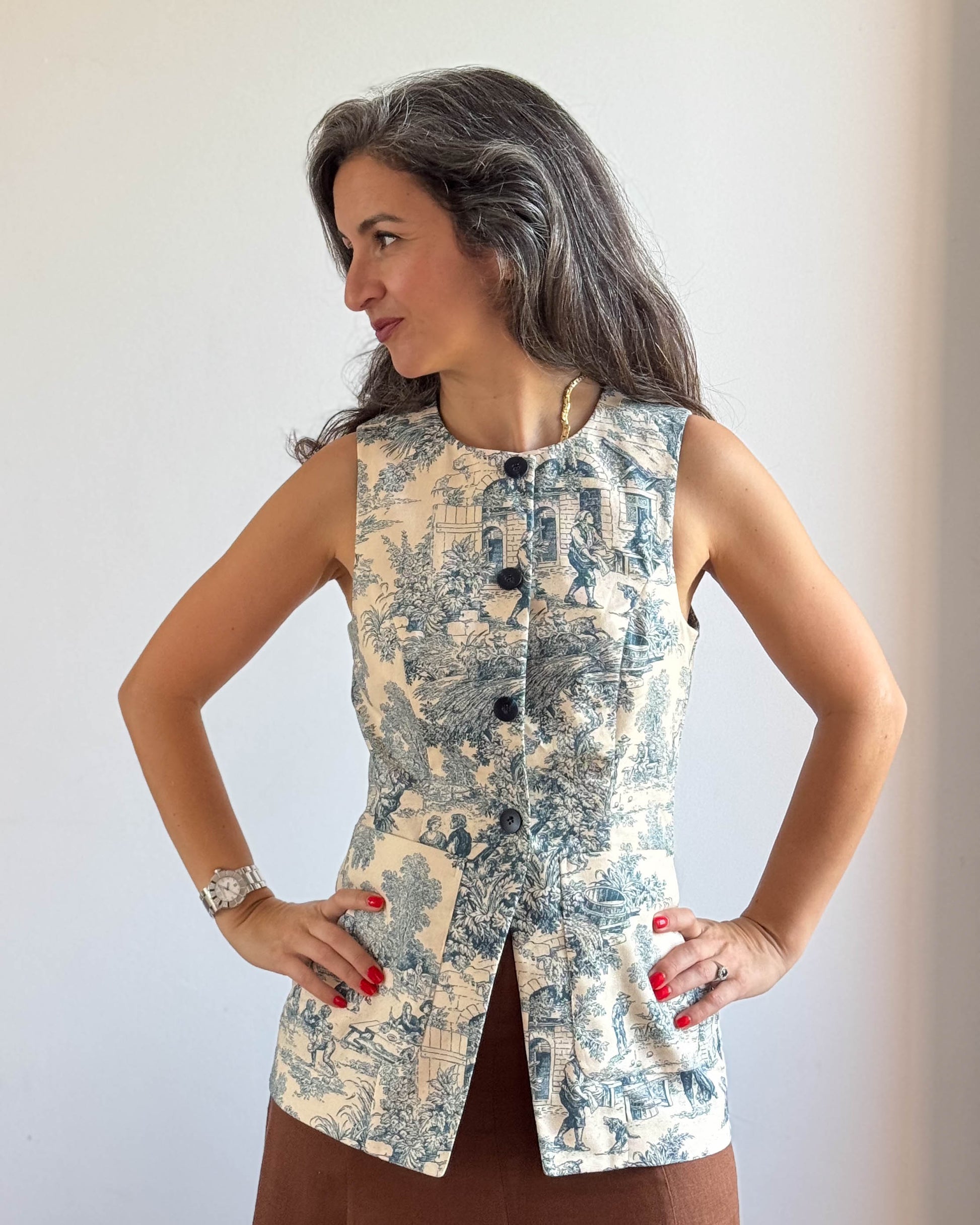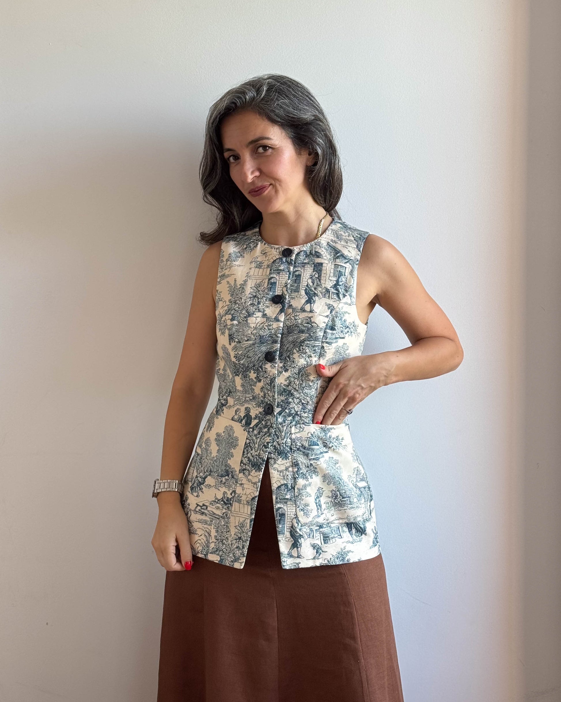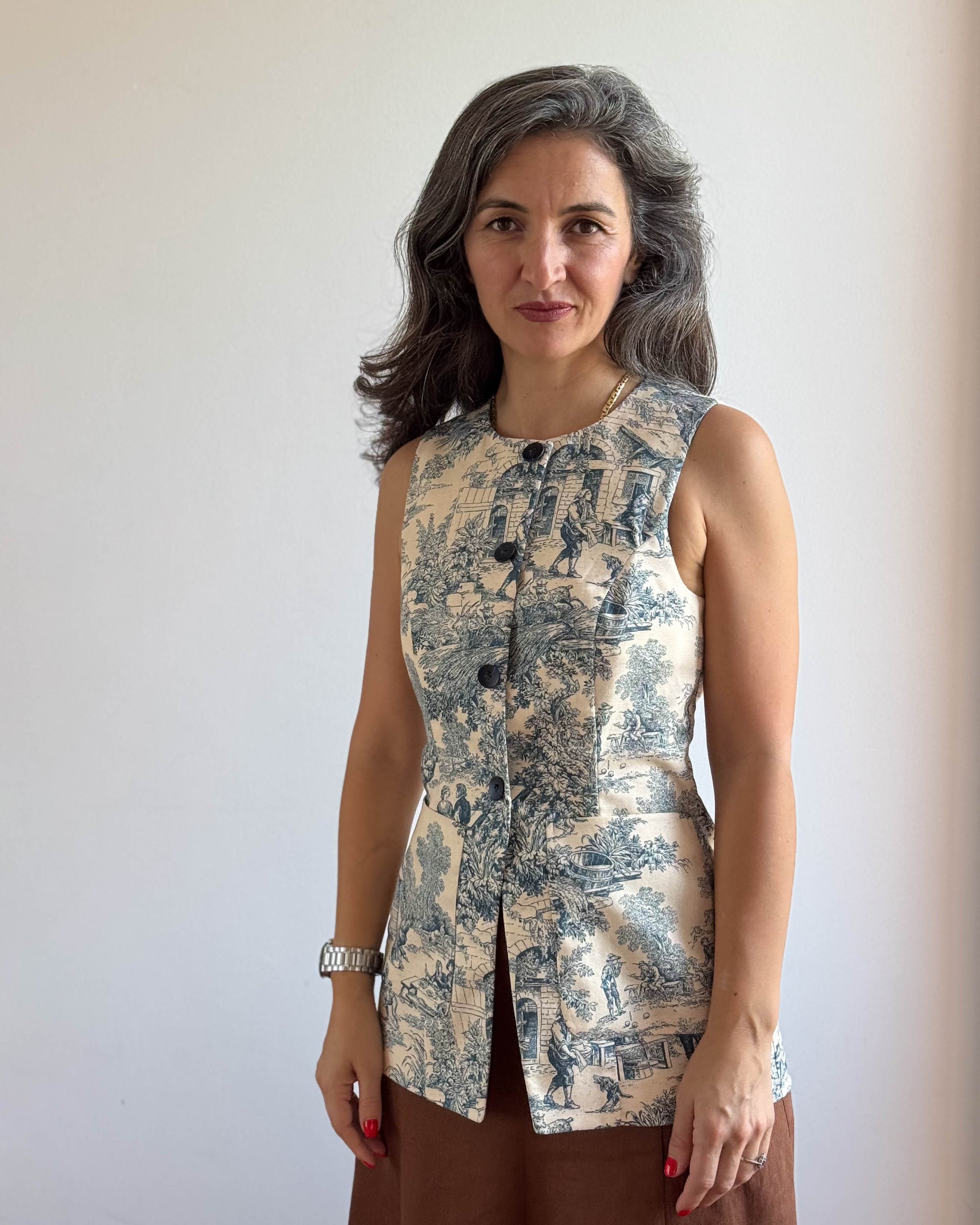 Love the tailored vest. I made it in a favorite long-stashed speckled cobalt Essex linen bland. I went with sz 44 and it fit perfectly without adjustments. I made a muslin in size 46 and found it was too big. I absolutely love the patch pocket instructions. But I had a hard time understanding how to sew the hem. I ended up with good results, but I will look for a video tutorial next time. I have more planned. I love the matching sets I've been seeing on Instagram.