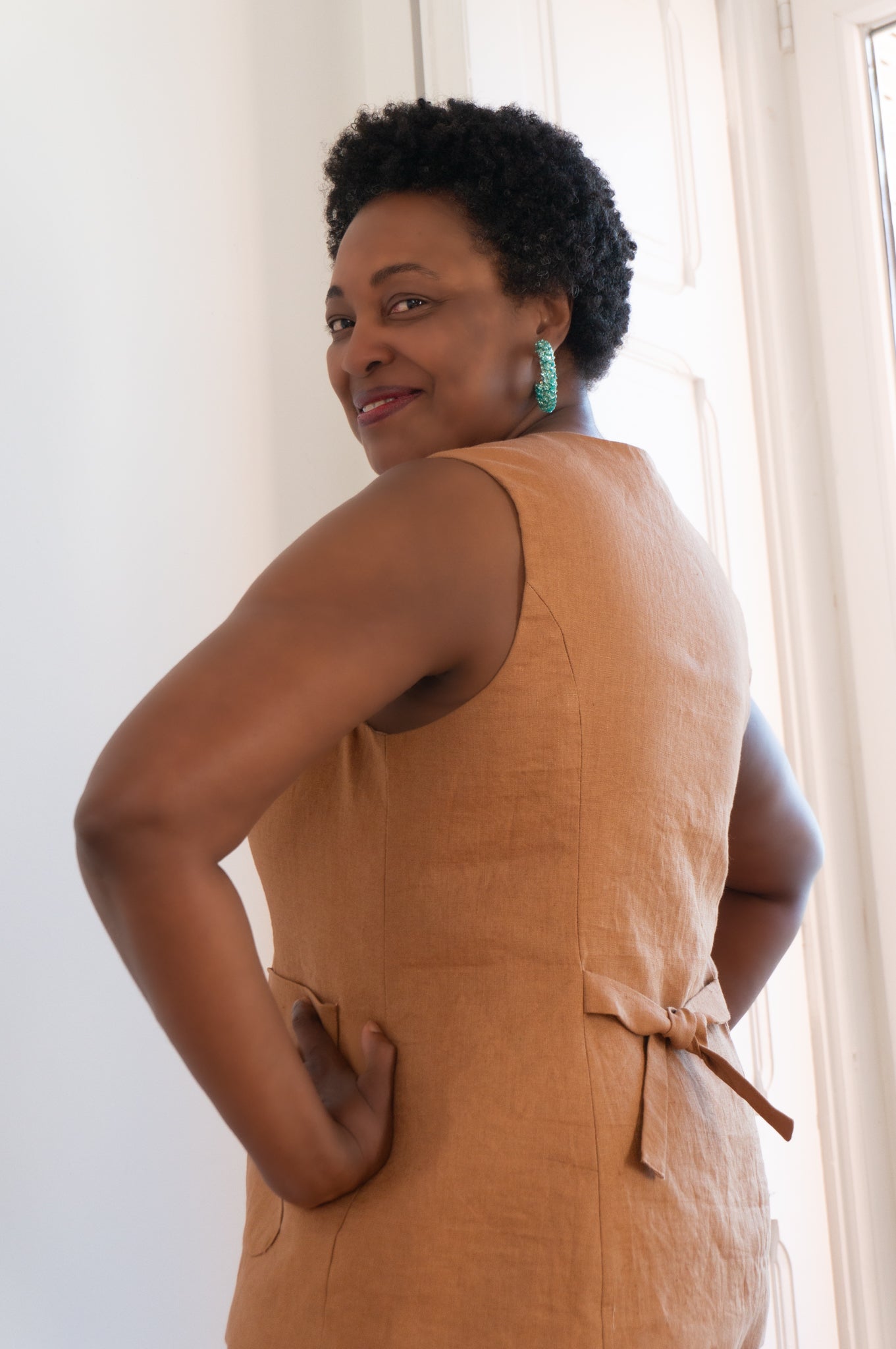 Samples are all sewn in heavy-weight linen suiting and mid-weight linen with an acetate or thin cotton lining. For this pattern, I recommend medium-weight woven fabrics with a good drape, such as wool suiting, wool crepe, lightweight wool tweed, cotton twill, linen, and linen-cotton blends.