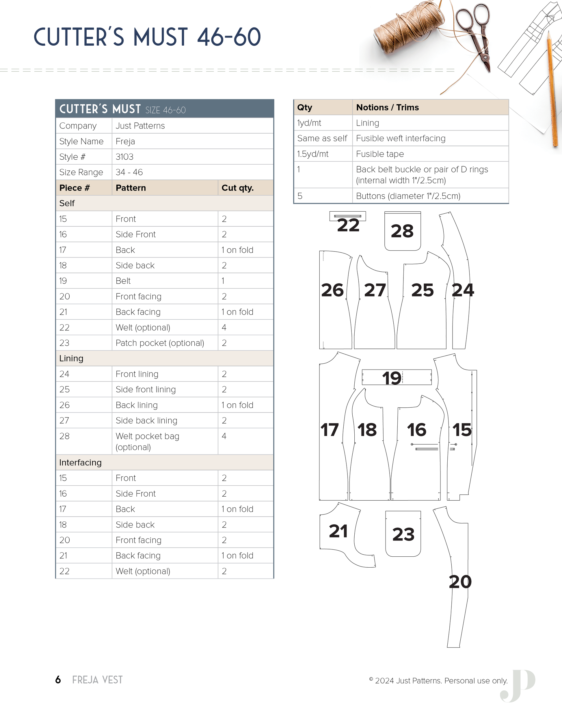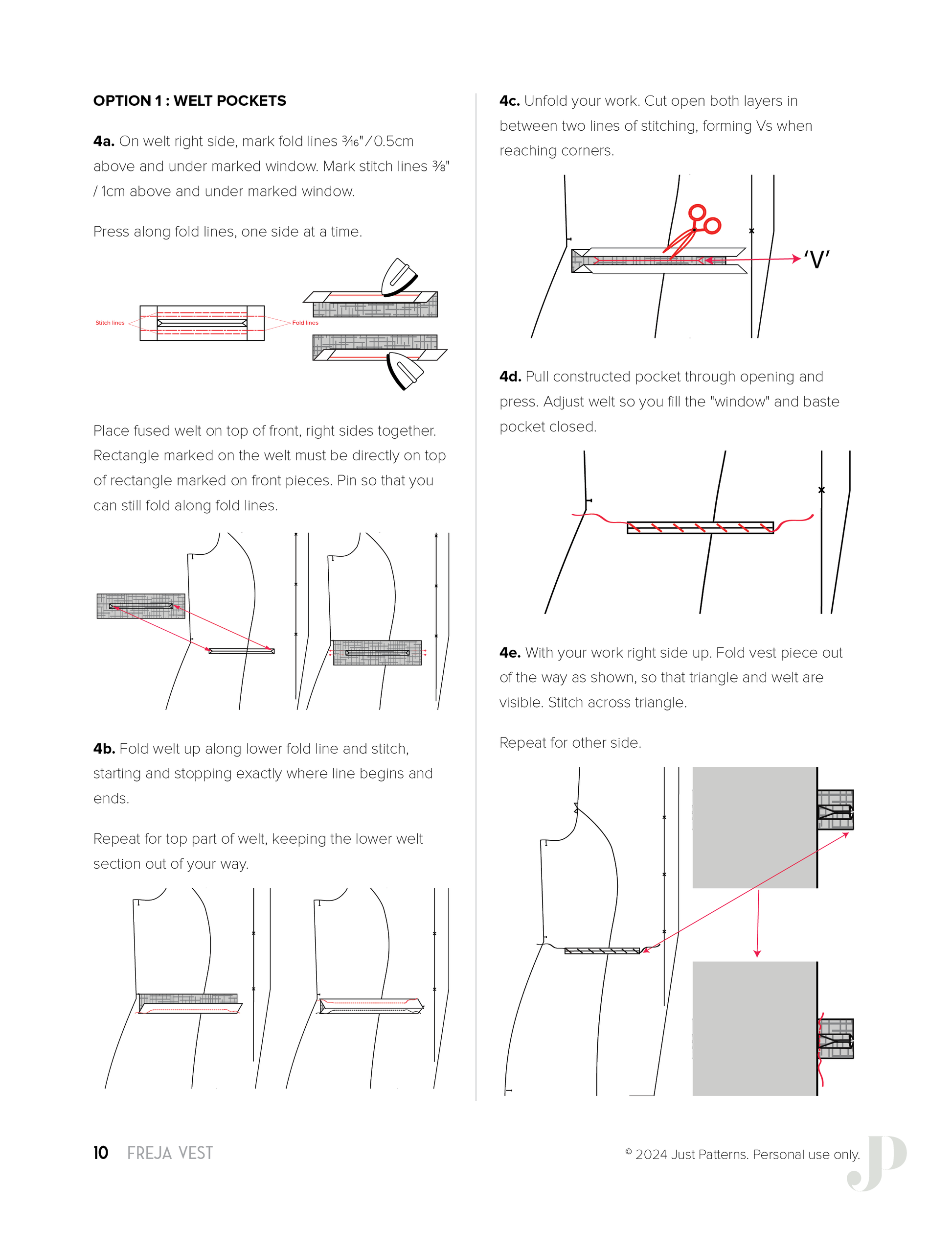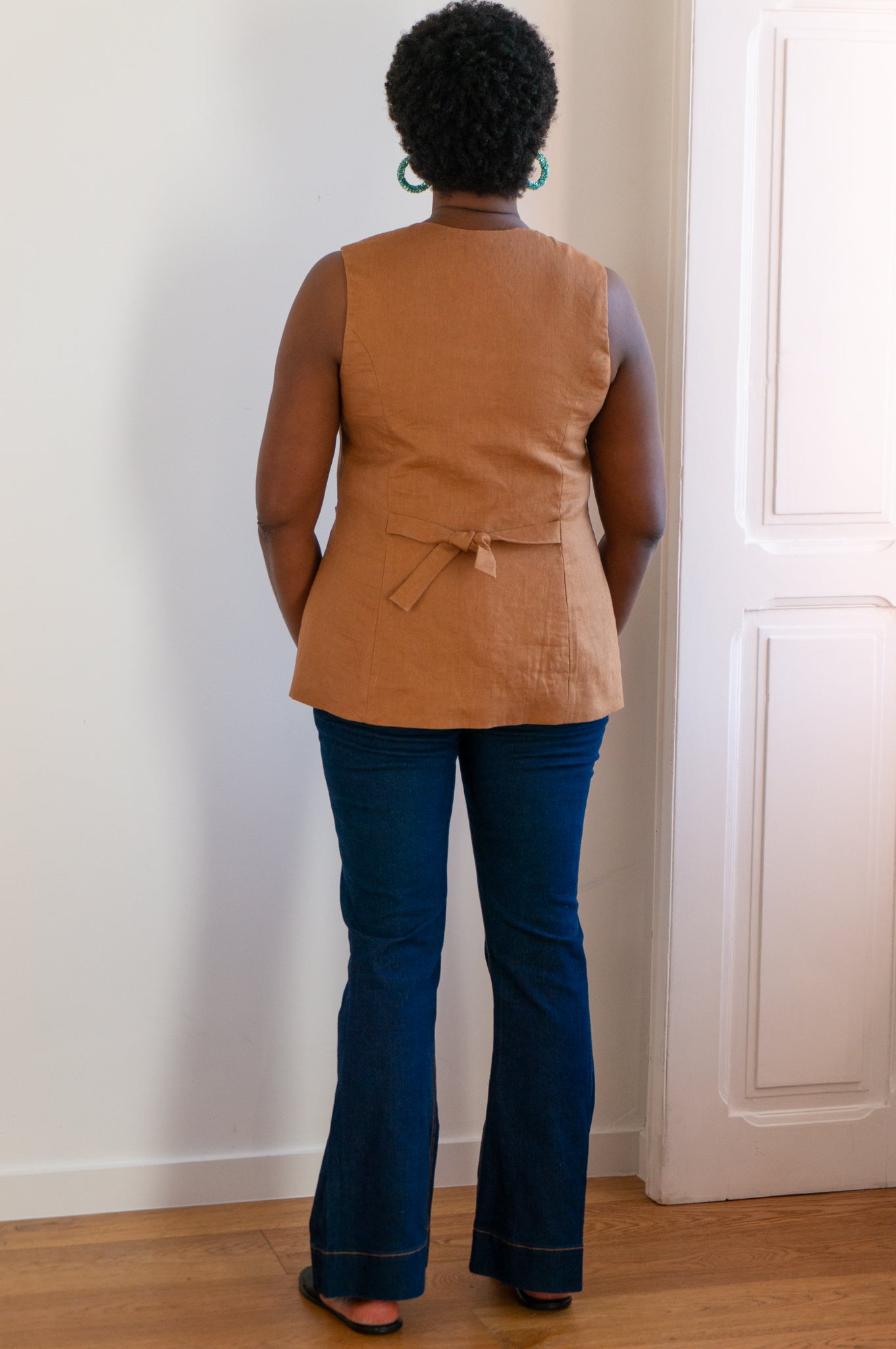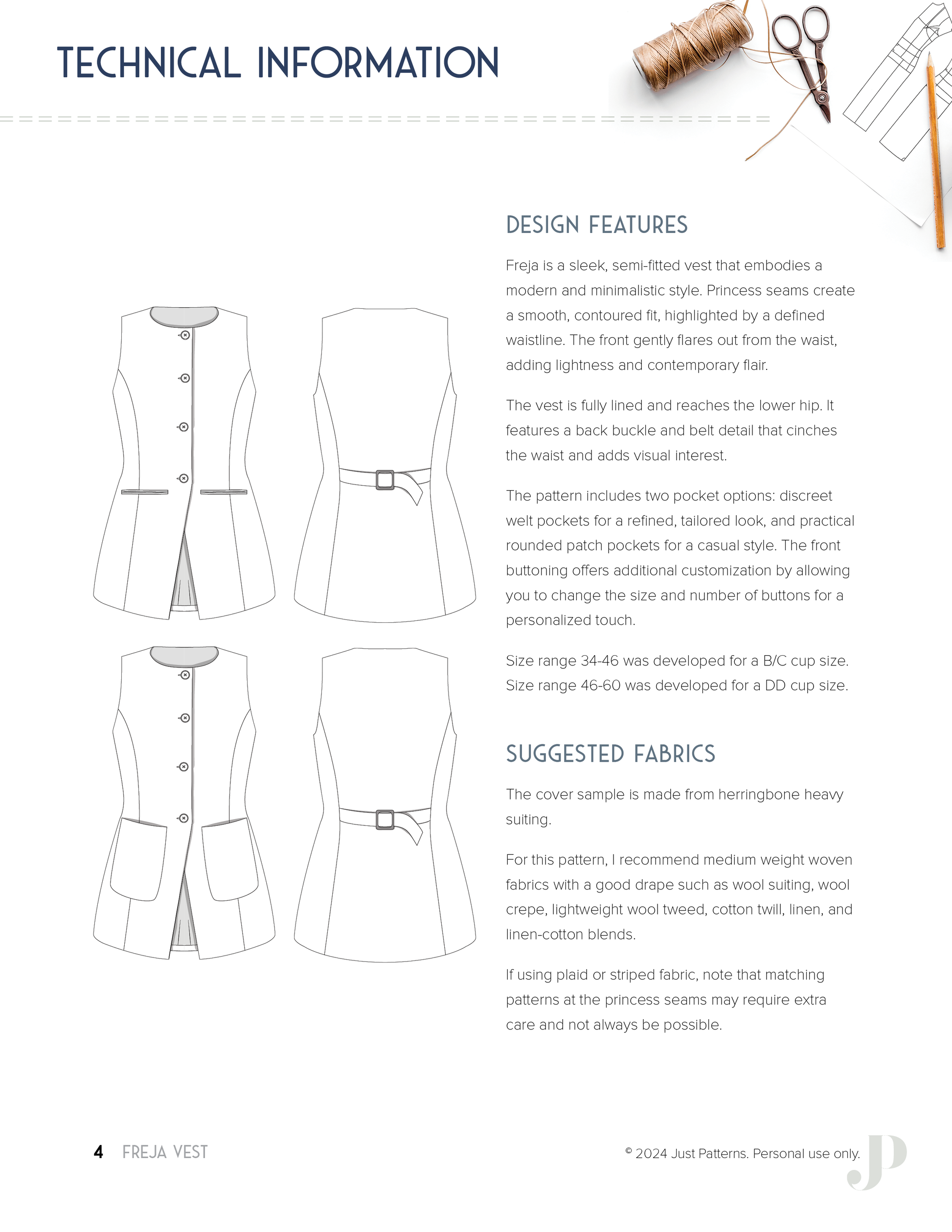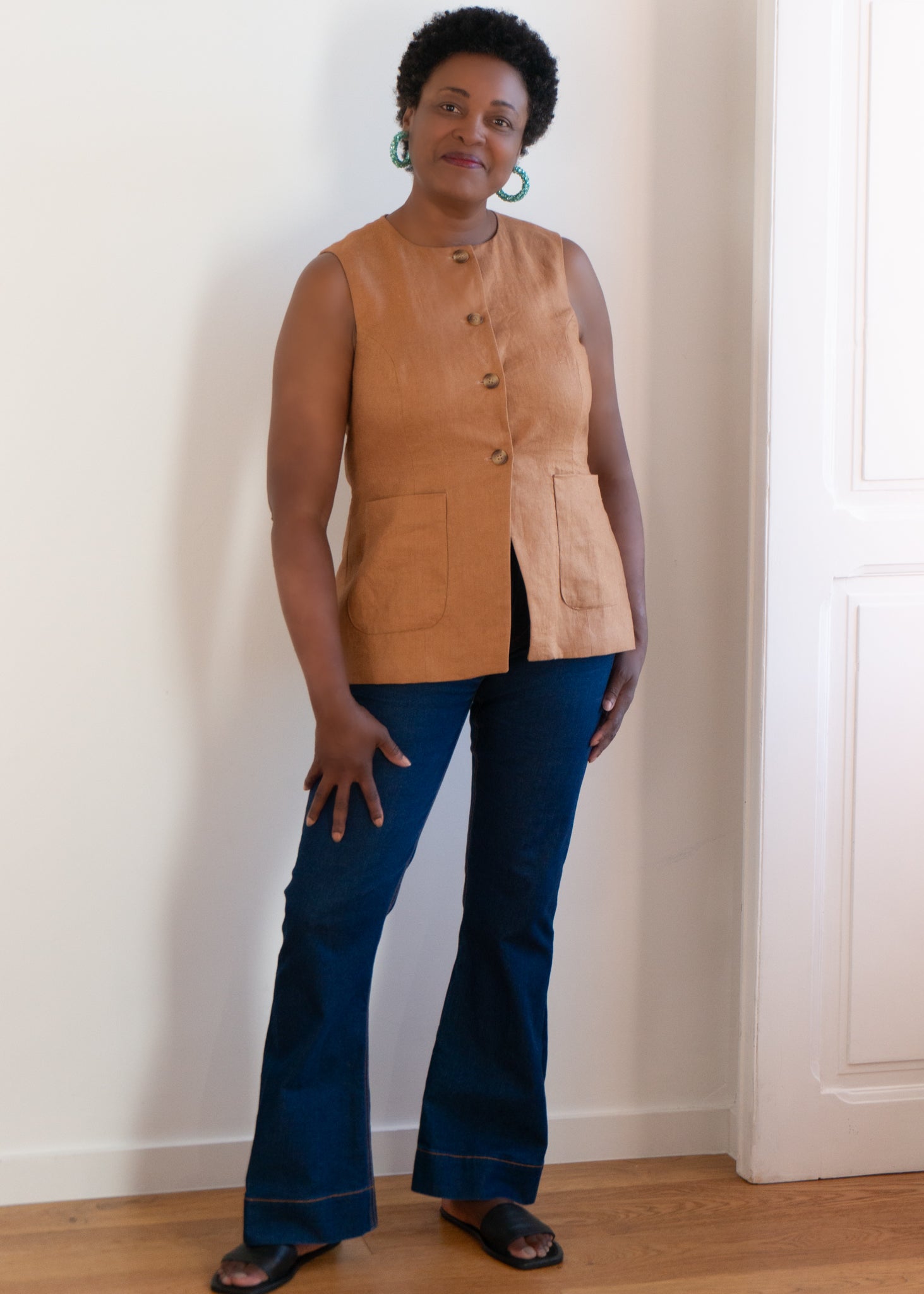 The pattern includes two pocket options: discreet welt pockets for a refined, tailored look, and practical rounded patch pockets for a casual style. The Freja Vest pattern now also comes with an optional unlined version, perfect for lighter fabrics or a softer, more relaxed silhouette. The add-on includes an alternative front facing, and the instructions guide you through this variation using front and back facings, with edge finishes that can be serged or bound.