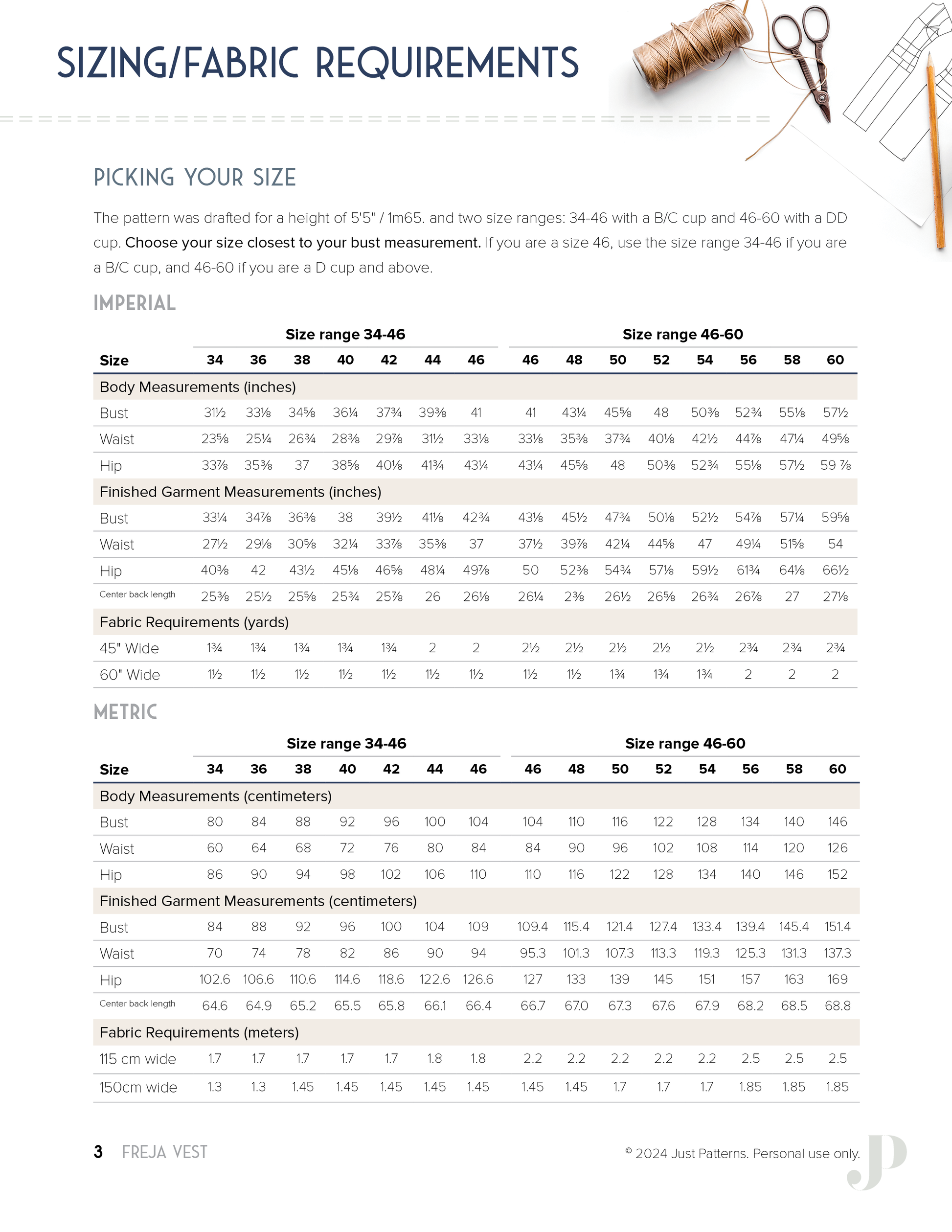 I draft and grade my sewing patterns for a height of 5’5” (1.65m) from size 34 to 60 (see below). When applicable, the size range is divided between 34-46, developed for B/C cup size, and 46-60, developed for a DD cup size.