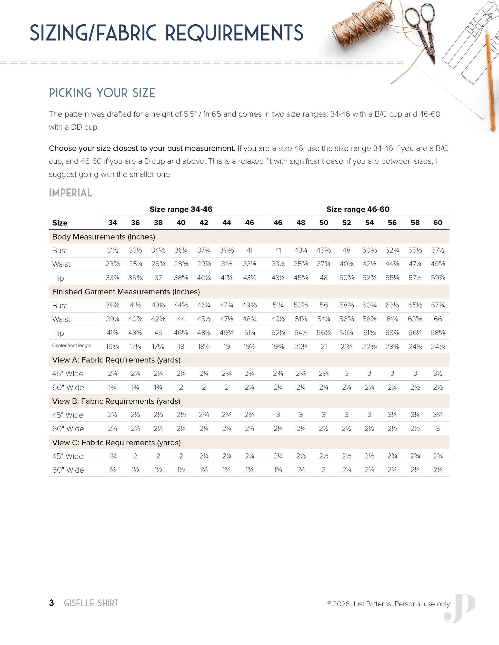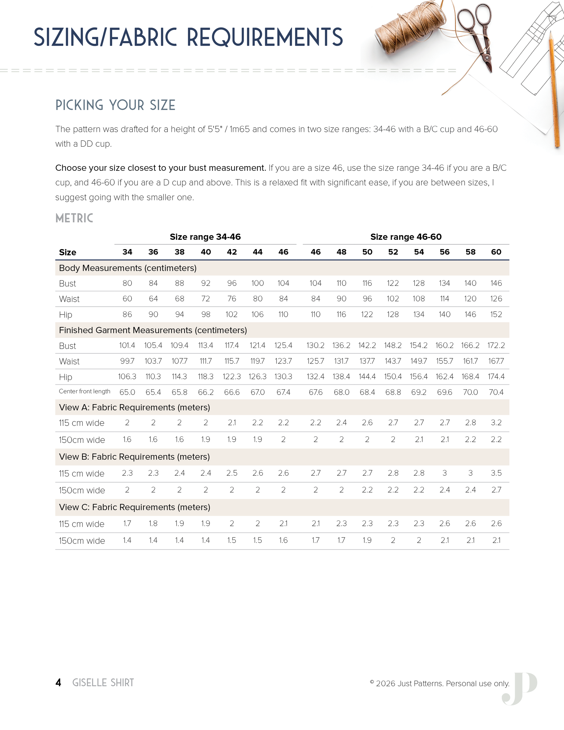 I draft and grade my sewing patterns for a height of 5’5” (1.65m) from size 34 to 60 (see below). When applicable, the size range is divided between 34-46, developed for B/C cup size, and 46-60, developed for a DD cup size.