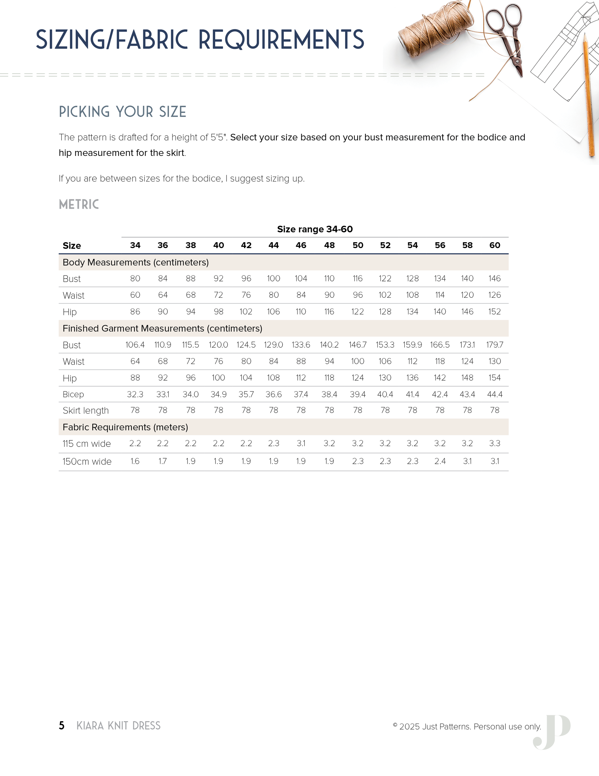I draft and grade my sewing patterns for a height of 5’5” (1.65m) from size 34 to 60 (see below). When applicable, the size range is divided between 34-46, developed for B/C cup size, and 46-60, developed for a DD cup size.