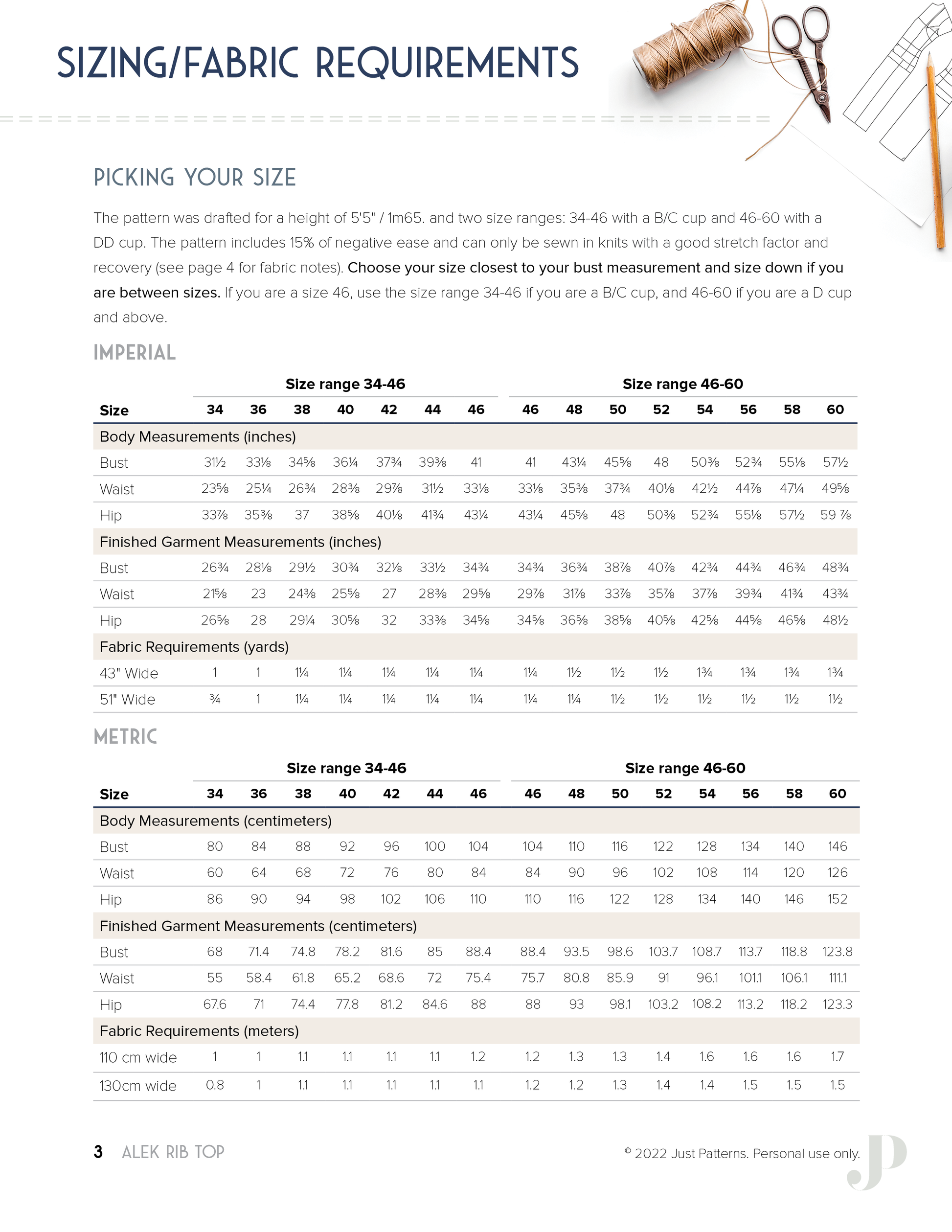 I draft and grade my sewing patterns for a height of 5’5” (1.65m) from size 34 to 60 (see below). When applicable, the size range is divided between 34-46, developed for B/C cup size, and 46-60, developed for a DD cup size.